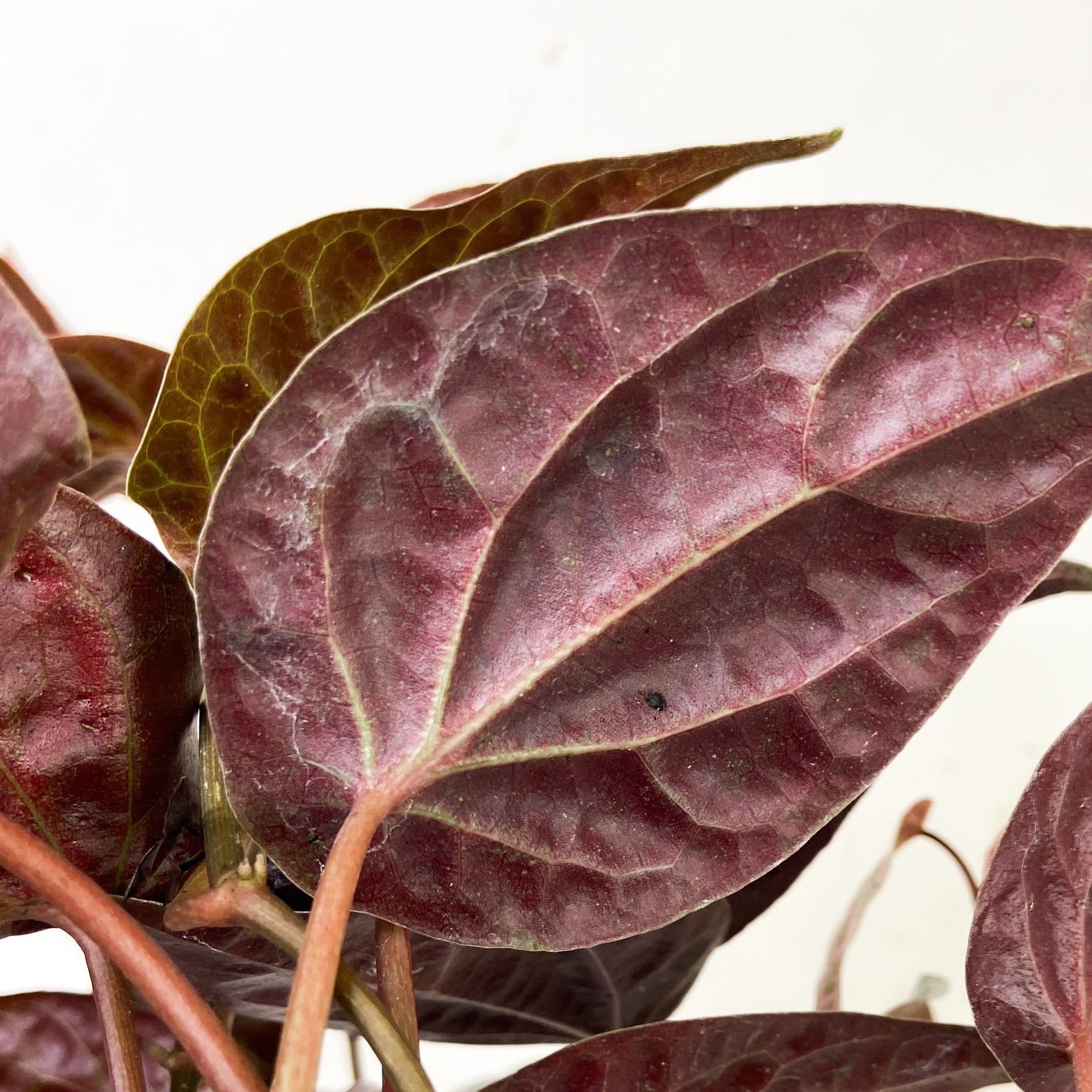 Piper crocatum is a climbing or tailing vine that is prized for its colourful leaves that makes it an exotic indoor plant. The plants usually do not give flowers when groomed indoors or outside of their own habitat. It is also known as pepper vine or chili pepper.