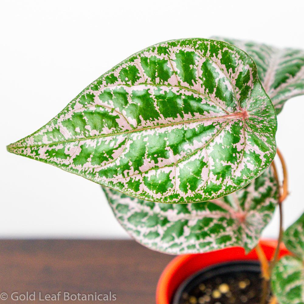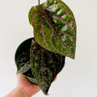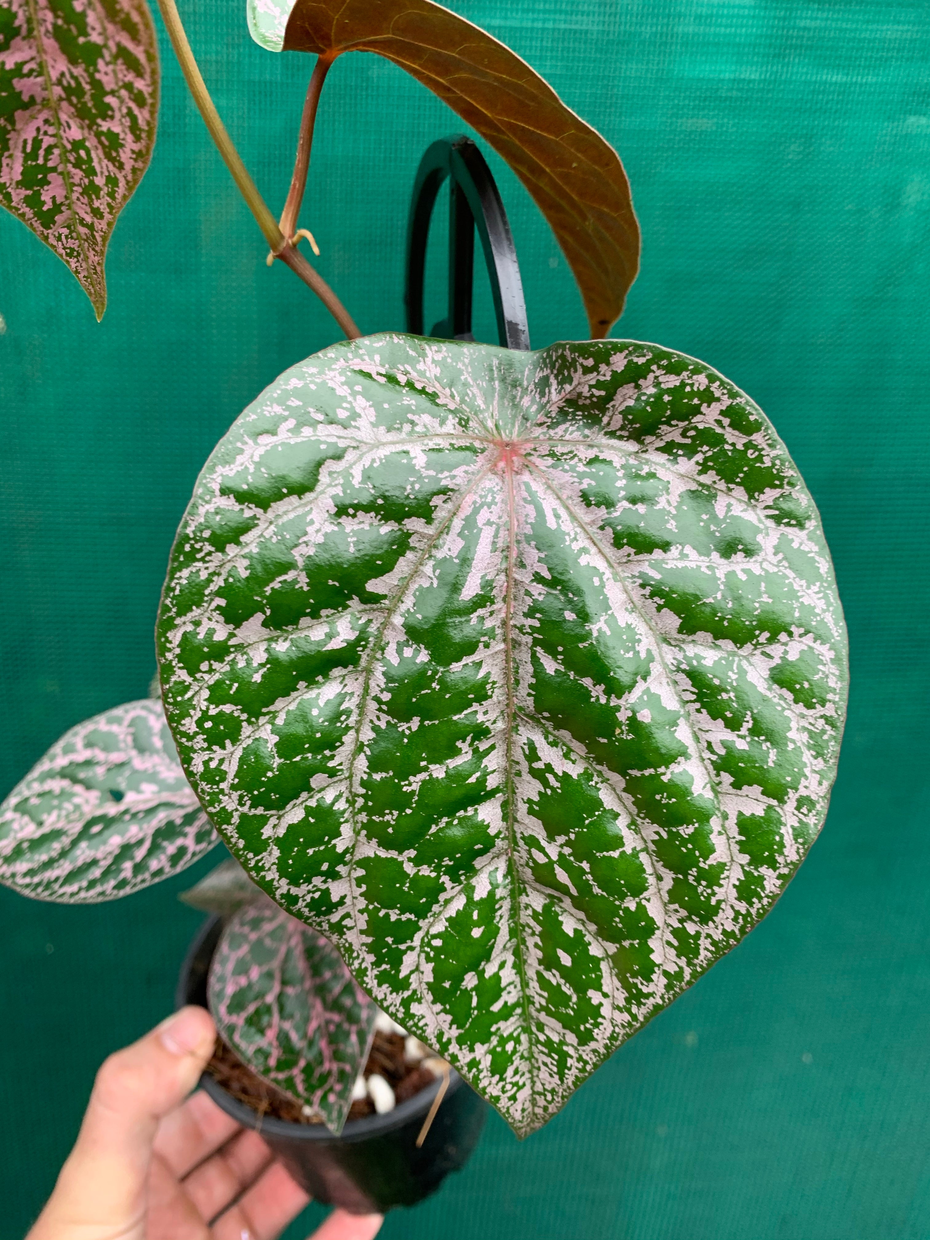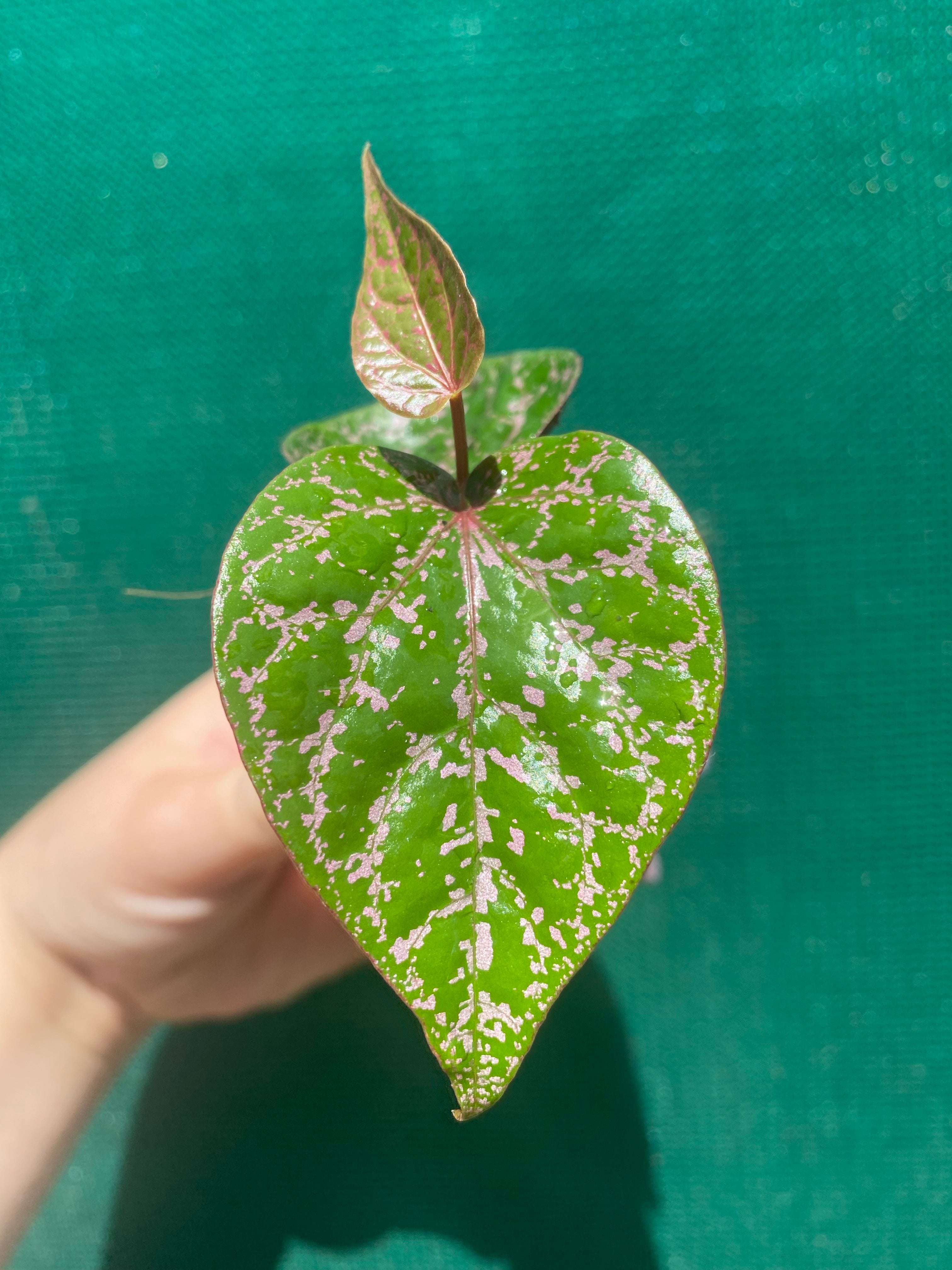 Web Piper Crocatum is a gorgeous vining plant that is coveted for its heart-shaped leaves with veins of shimmering silver and pink. Please be aware that these plants DO NOT like the cold we learnt this the hard way. The flowers are white and grow in clusters at the end of the stem.